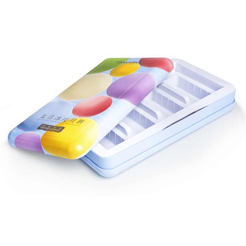 ◆ Печать: 4C (CMYK) офсетная печать, один цвет Pantone, белый лак и глянцевое покрытие для внешней стороны крышки; 4C (CMYK) офсетная печать, цвет Pantone и белый лак для внешней стороны корпуса; Серебряный лак для внешней стороны дна и внутренней части жестяной коробки.